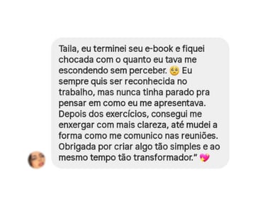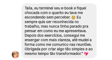 Sou criadora de conteúdo digital e infoprodutos na área de desenvolvimento pessoal e profissional. Meu propósito é guiar pessoas a conquistarem independência, confiança e reconhecimento. Tomar decisões mais conscientes, evitar a autossabotagem e alcançar resultados eficazes na vida pessoal e profissional.
